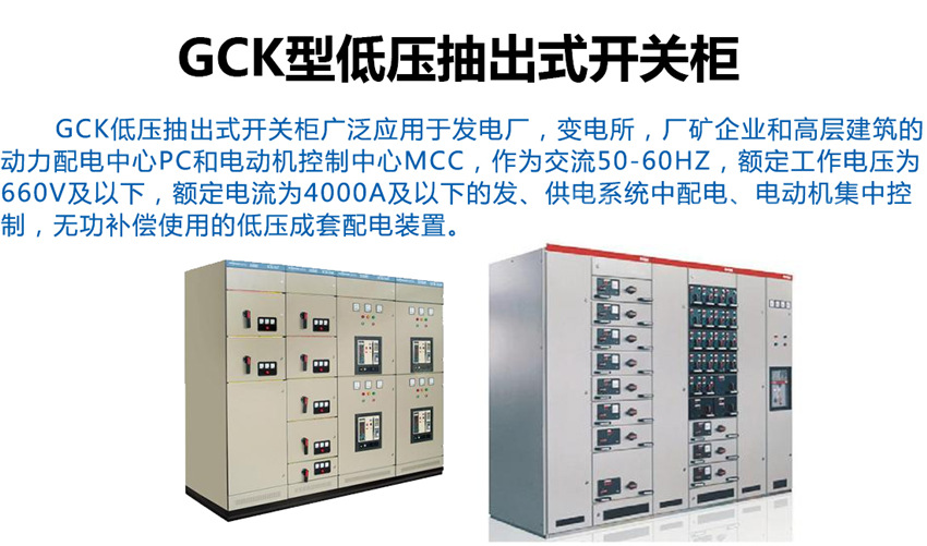 GCK-低壓抽出式開關(guān)柜適用于發(fā)電廠、冶金、石油化工、輕工紡織、港口碼頭、大樓賓館等場所作為交流三相四線或五線制、電壓380V、頻率50H2電力系統(tǒng)的配電和電動機(jī)控制之用。