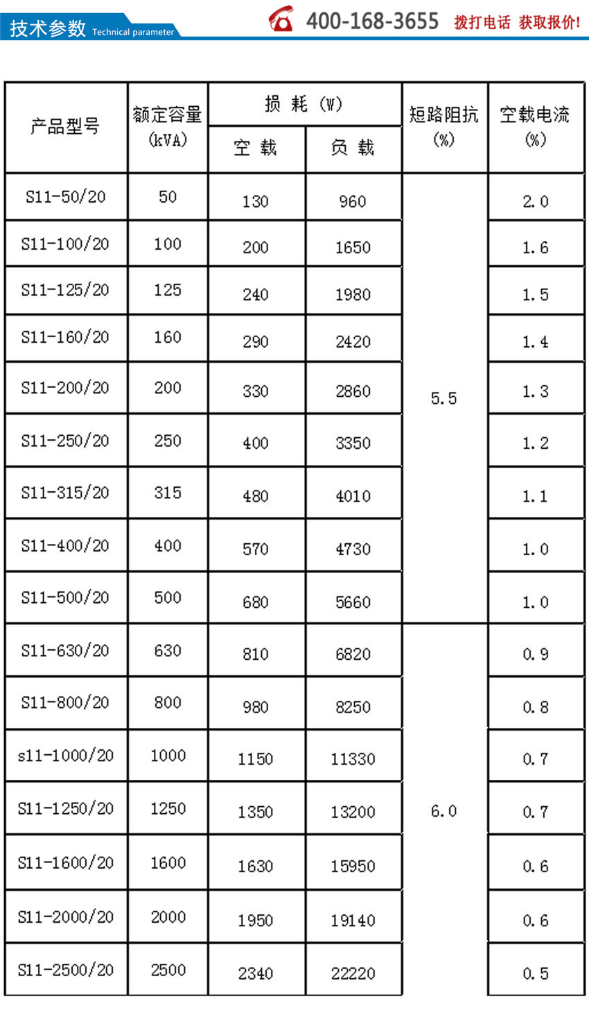 S11系列產(chǎn)品在S9系列的基礎(chǔ)上,空載損耗平均降低了30%;空載電流比S9下降70-85%;平均溫升降低10K,產(chǎn)品使用壽命增加一倍多,即使在超負載20%的條件下仍可長期運行;產(chǎn)品運行噪音平均降低2-4分貝。